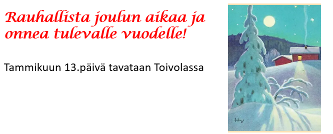 Kokoonnumme talvikaudella tiistaisin klo 12:30 työväentalo Toivolassa, Puutarhatie 1.