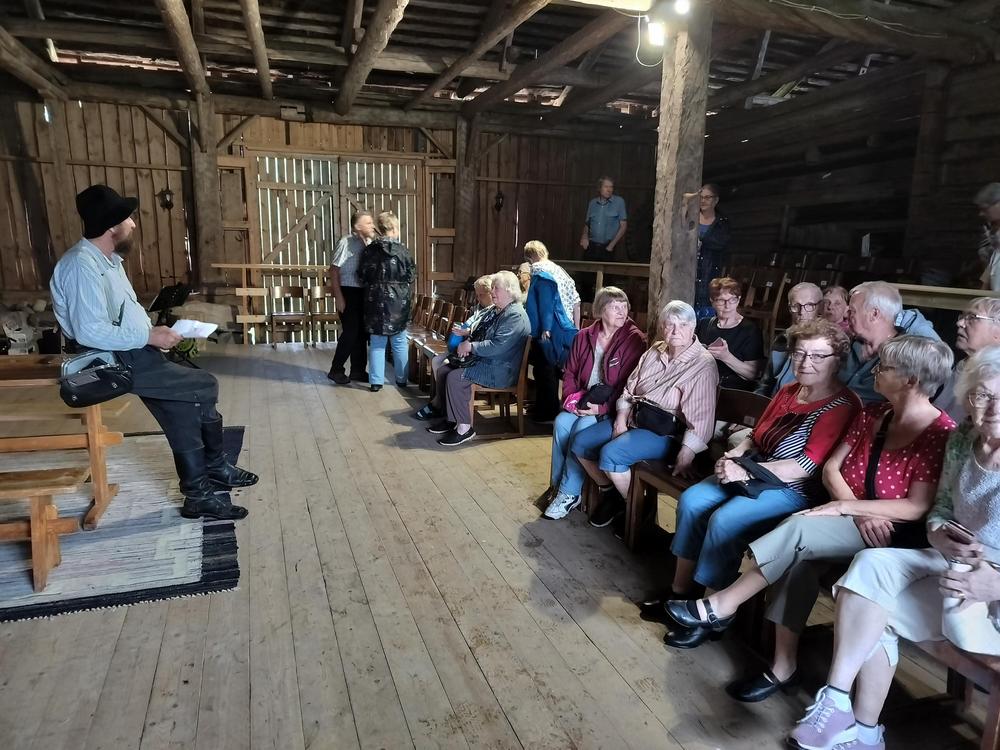 Oppaan jäädessä pois linja-autosta lähdimme kotiin päin ja aika moni ihmetteli, että tässäkö tämä oli. Mutta jonkin matkaa ajettuamme linja-auto kääntyi pienelle hiekkatielle ja pian alkoi näkymään TV:stä tuttuja maisemia. Tulimme Häkkilän tilalle, missä kuvataan TV-sarjaa Farmi. Itse pehtoori oli vastassa ja ohjasi meidät istumaan teatterin katsomoon.