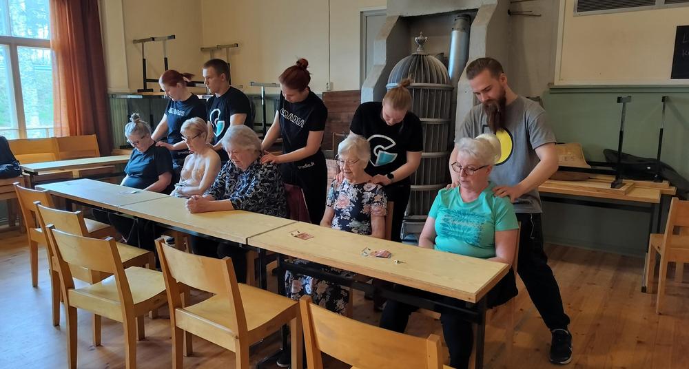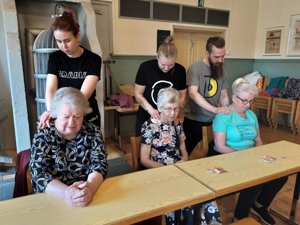 Gradian hierojaopiskelijat kävivät tekemässä halukkaille puolen tunnin niska- hartiahieronnan pientä maksua vastaan.